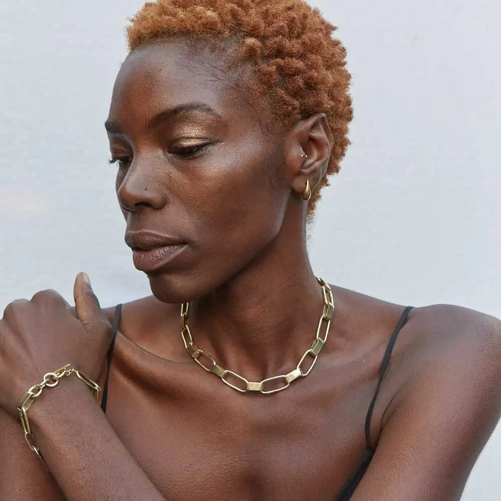 A modern chain collar handcrafted in Kenya from 24K gold-plated recycled brass. Defined by alternating interlocking links, it brings structure, movement, and a refined edge to everyday style.